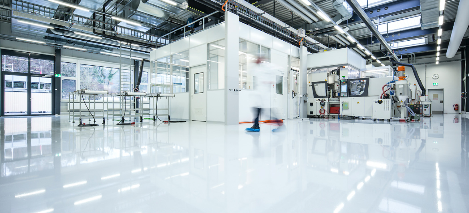 Was man dabei niemals vergessen darf, sind die Menschen, die in diesem Produktionsumfeld arbeiten. Ihre Mitarbeiter sollten sich an ihrem Arbeitsplatz wohlfühlen und ihrer Beschäftigung in einem angenehmen Betriebsklima nachgehen können. Zu diesem Zweck beziehen wir Überlegungen zu einem ergonomischen Arbeitsumfeld in unsere Planungsarbeiten ein. Dabei finden auch Aspekte wie Raumklima, Beleuchtung und Sicht ins Freie grosse Beachtung.